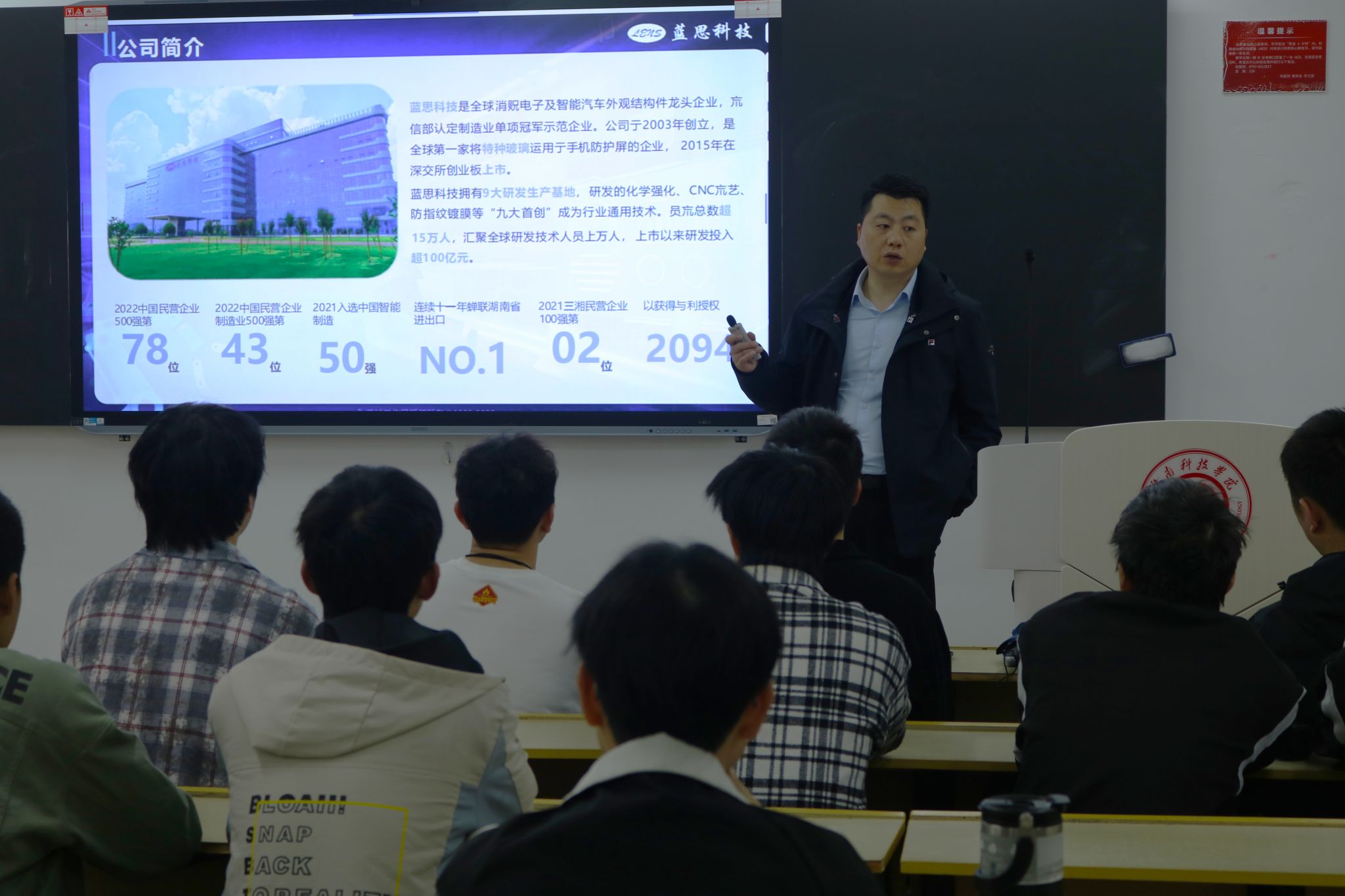 宣讲会上,蓝思科技的宣讲人朱先生详细介绍了公司的发展概况、企业文化、业务领域以及未来发展规划。公司于2003年创立,是全球第一家将特种玻璃运用于手机防护屏的企业,2015年在深交所创业板上市。作为智能终端一站式设计制造商,蓝思科技在行业内享有盛誉,其卓越的创新能力和广阔的市场前景为员工们提供了广阔的职业发展空间。