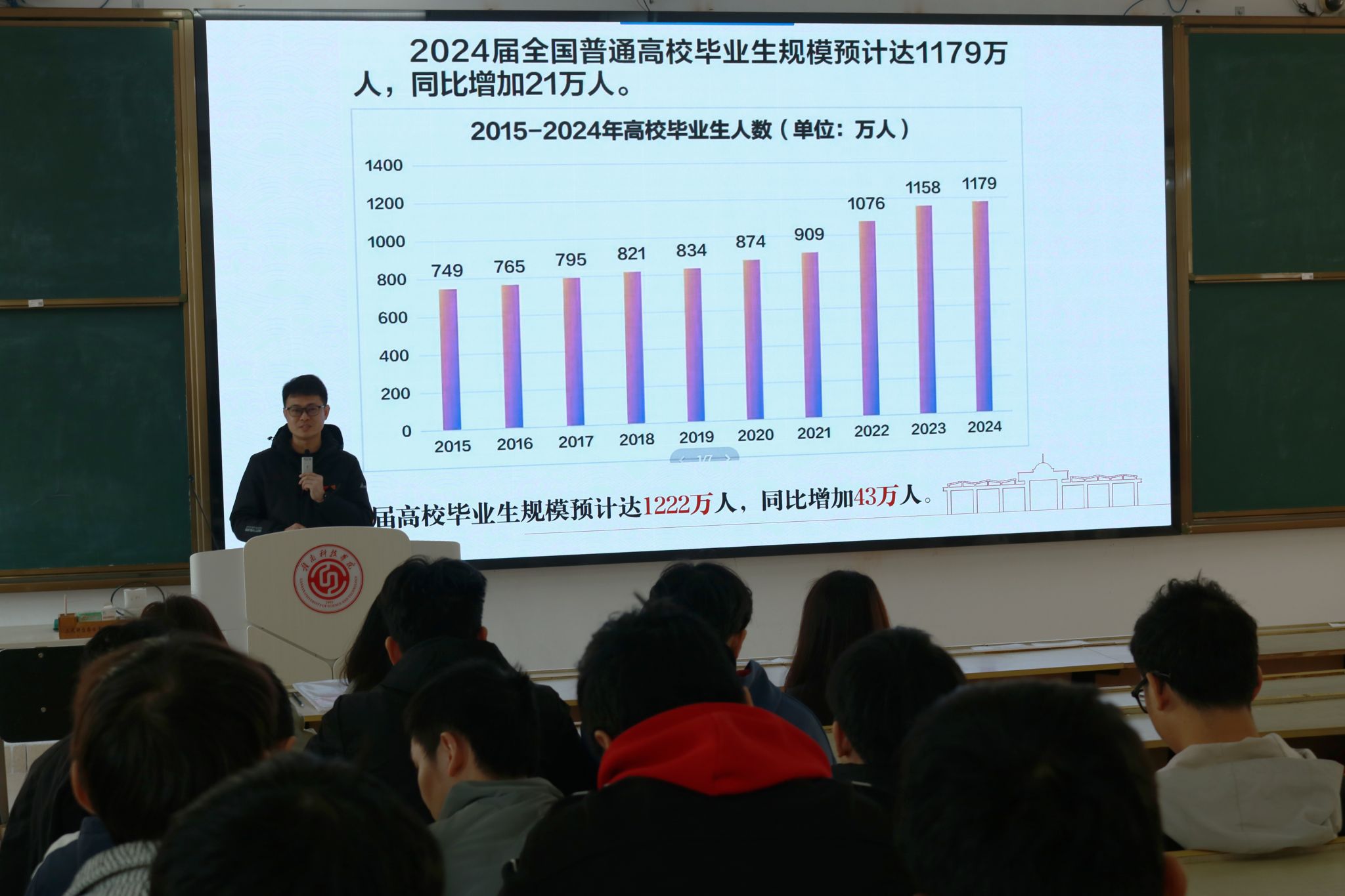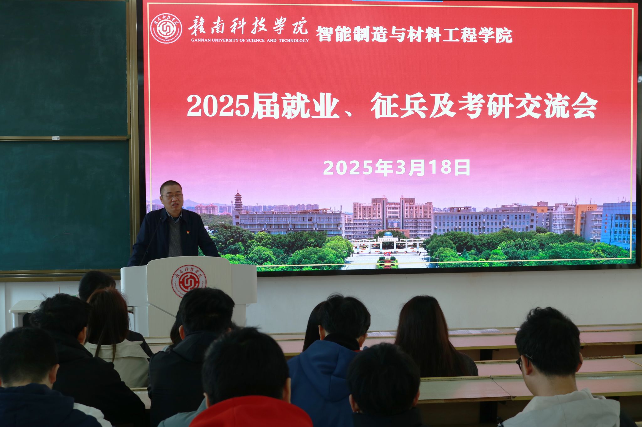 本网讯:为深入贯彻落实国家就业优先战略,切实做好2025届毕业生就业服务与指导工作,3月18日上午,伟德BV官网于崇善楼Z1D2教室召开专题交流会,聚焦就业、征兵、考研三大主题,为毕业生明晰发展方向、凝聚奋进力量。智能制造与材料工程公司党委副书记朱根松,党委委员肖志华,毕业班辅导员及200余名毕业生代表共同参会。