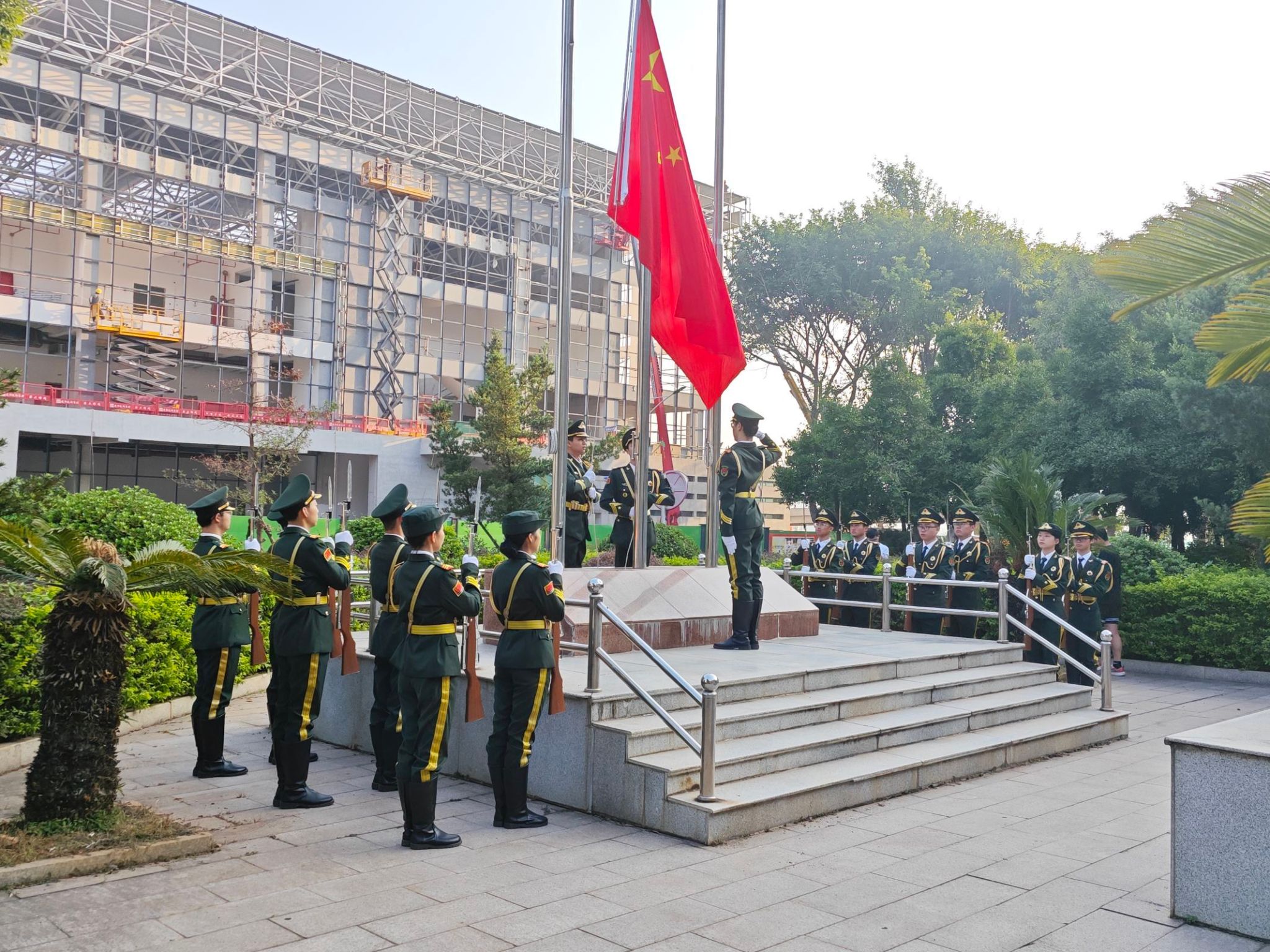 在庄严肃穆的氛围中,五星红旗伴随着雄壮的国歌声缓缓升起,全体师生行注目礼,表达对祖国的忠诚与热爱。