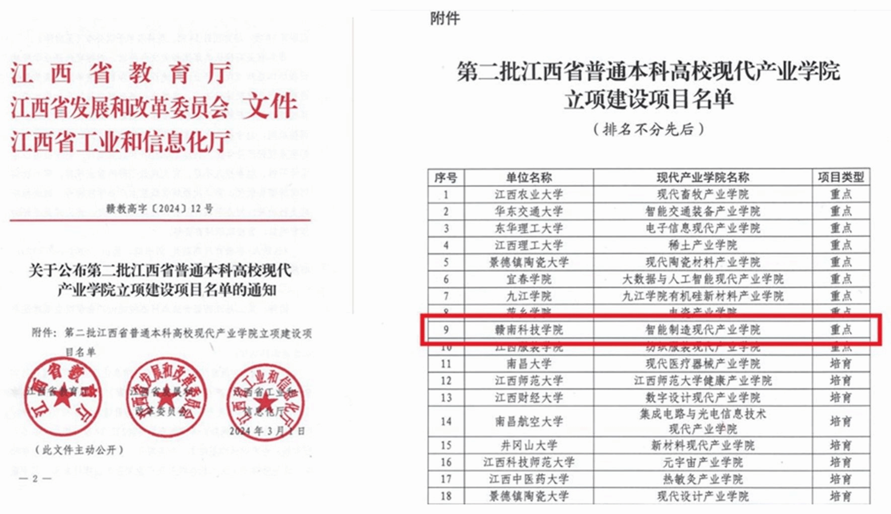 江西省教育厅、江西省发展和改革委员会、江西省工业和信息化厅联合印发《关于公布第二批江西省普通本科高校现代产业公司立项建设项目名单的通知》(赣教高字〔2024〕12号),此次全省共立项重点项目10项、培育项目14项。公司智能制造现代产业公司荣获省级重点项目。实现了公司省级现代产业公司零的突破。