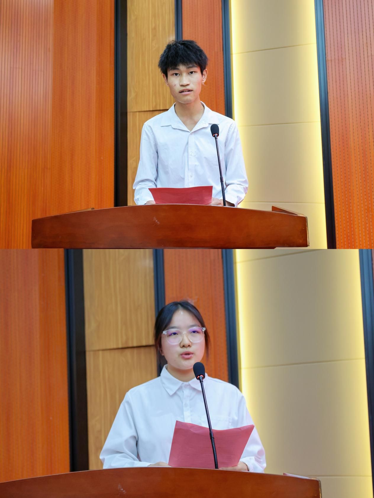 肖志华、关开荣分别宣读了“川泉”奖学金和“爱云”奖学金的获奖者名单。“川泉”奖学金获奖者代表冶金222班王宇和“爱云”奖学金获奖者代表材控241班李春燕分别上台发言。他们深切表达了对关心支持教育事业的员工感激之情,并分享了他们在校的专业学习和实践创新经历,两位同学的演讲极大地触动了全场师生,也以自己的言行默默感染了身边的同学。