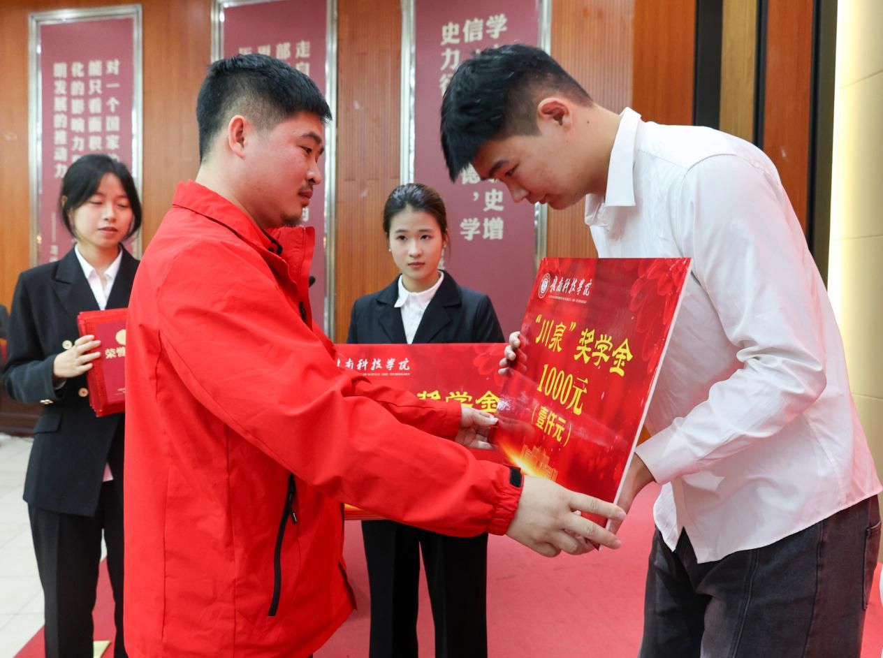 曾庆鸿为获“川泉”奖学金员工颁发荣誉证书及奖金牌,左群为获“爱云”奖学金员工颁发荣誉证书及奖金牌,台下响起热烈掌声。