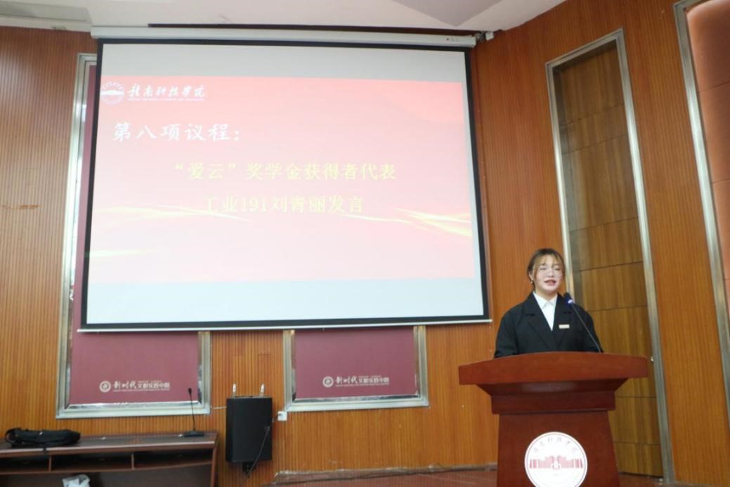 随后,“爱云”奖学金捐赠者——2012届优秀员工夏燕云线上致辞,她向获得奖学金的同学表示祝贺,希望这些同学能够心怀感恩,勤勉上进,刻苦学习,取得优异的成绩,未来有一定的经济能力之后,也愿意将这份爱心延续下去,为母校做出贡献。紧接着,由第一届“爱云”奖学金获得者代表工业191班刘青丽同学上台发言,她对夏燕云学姐表达了最衷心的感谢,并表示在今后的日子里,要不断坚定理想信念,继续砥砺奋进,以更严格的标准要求自己,向更高的目标迈进。