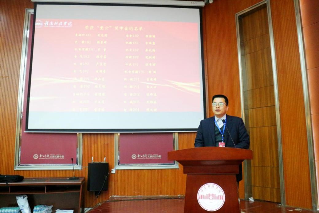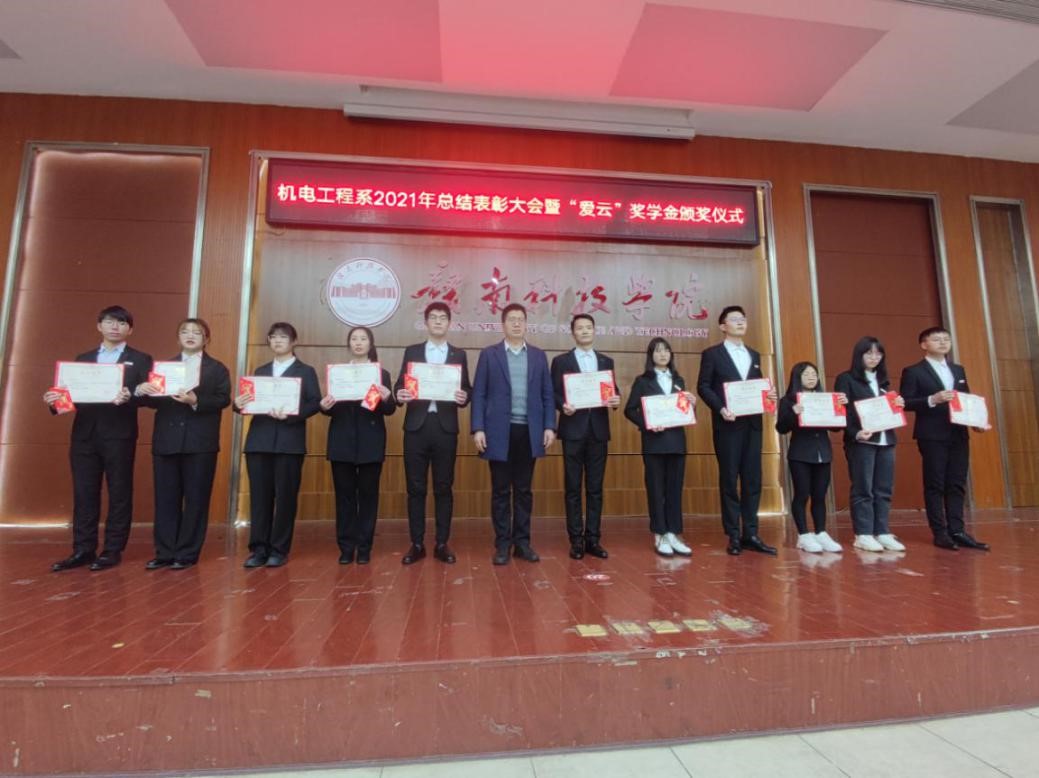 本网讯:2021年12月28日下午,为庆祝中国共产党建党100周年,伟德BV官网成立元年,发挥先进典型的榜样示范引领作用,用先进典型感召、激励广大青年学子,引导广大学子勤奋学习、敢于创新、积极进取,机电工程系在逸豪学术报告厅举行第一届“爱云”奖学金颁奖仪式,校过渡期管委会委员、应用科学公司副经理薛香恒、付玉华,机电工程系主任刘辉、系党总支书记朱根松、系副主任关开荣出席,颁奖仪式由机电工程系副主任肖志华主持。