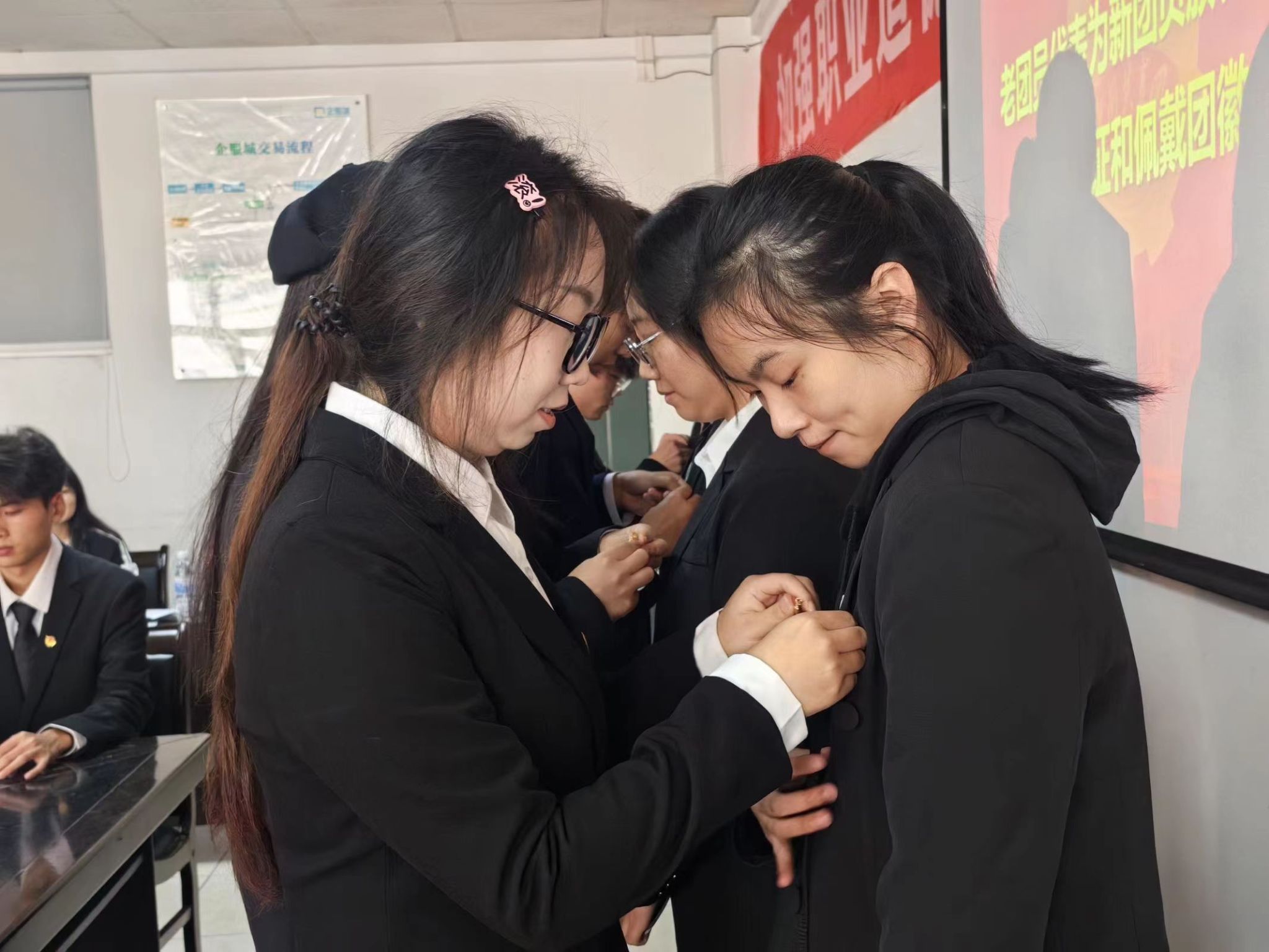 入团仪式开始,全体人员起立奏唱《中华人民共和国国歌》,随后由卢名亮宣布2023年新团员名单,老团员为新团员颁发团员证、佩戴团徽。