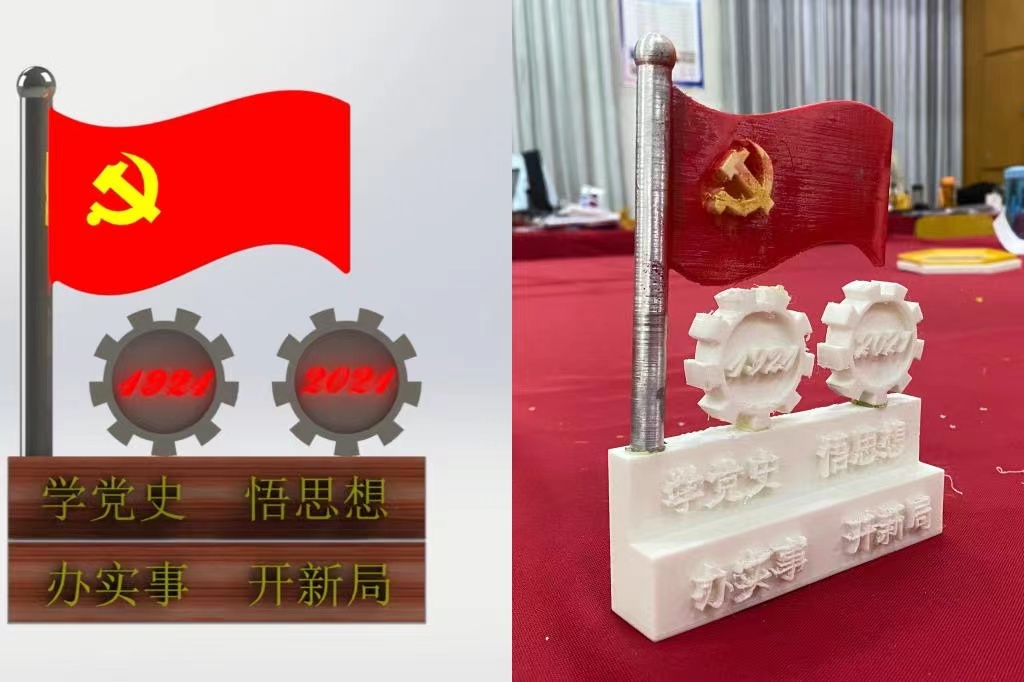 本人是机械专业,联想到专业具有代表性的传动件——齿轮可以代替“0”,党的旗帜的轴代替“1”,使用solid works软件,建好3D模型,使用PLC可再生材料,经过3D打印机高温熔化打印成型。