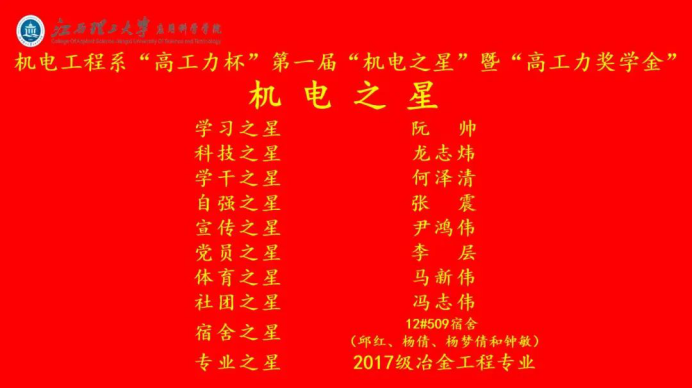 喜迎建党100周年,公司建院20周年,充分展示我系优秀学子风采,发挥先进典型的榜样示范作用,用先进典型感召、激励广大青年学子,引导广大学子勤奋学习、勇于实践、敢于创新、积极进取,2021年6月1日,我系在图书馆报告厅隆重举行江西理工大学应用科学公司“高工力杯”第一届“机电之星”暨“高工力奖学金”终评会。