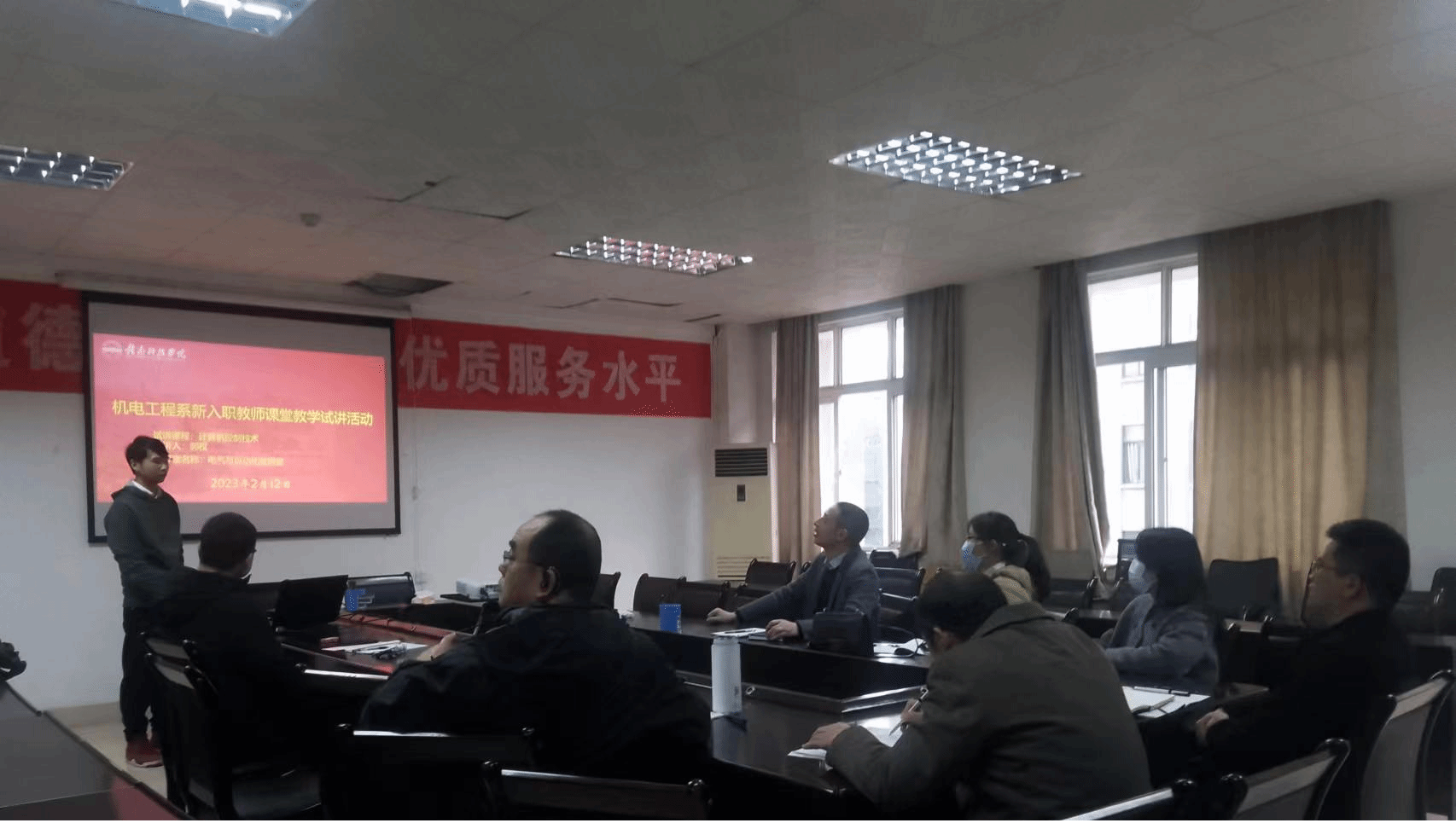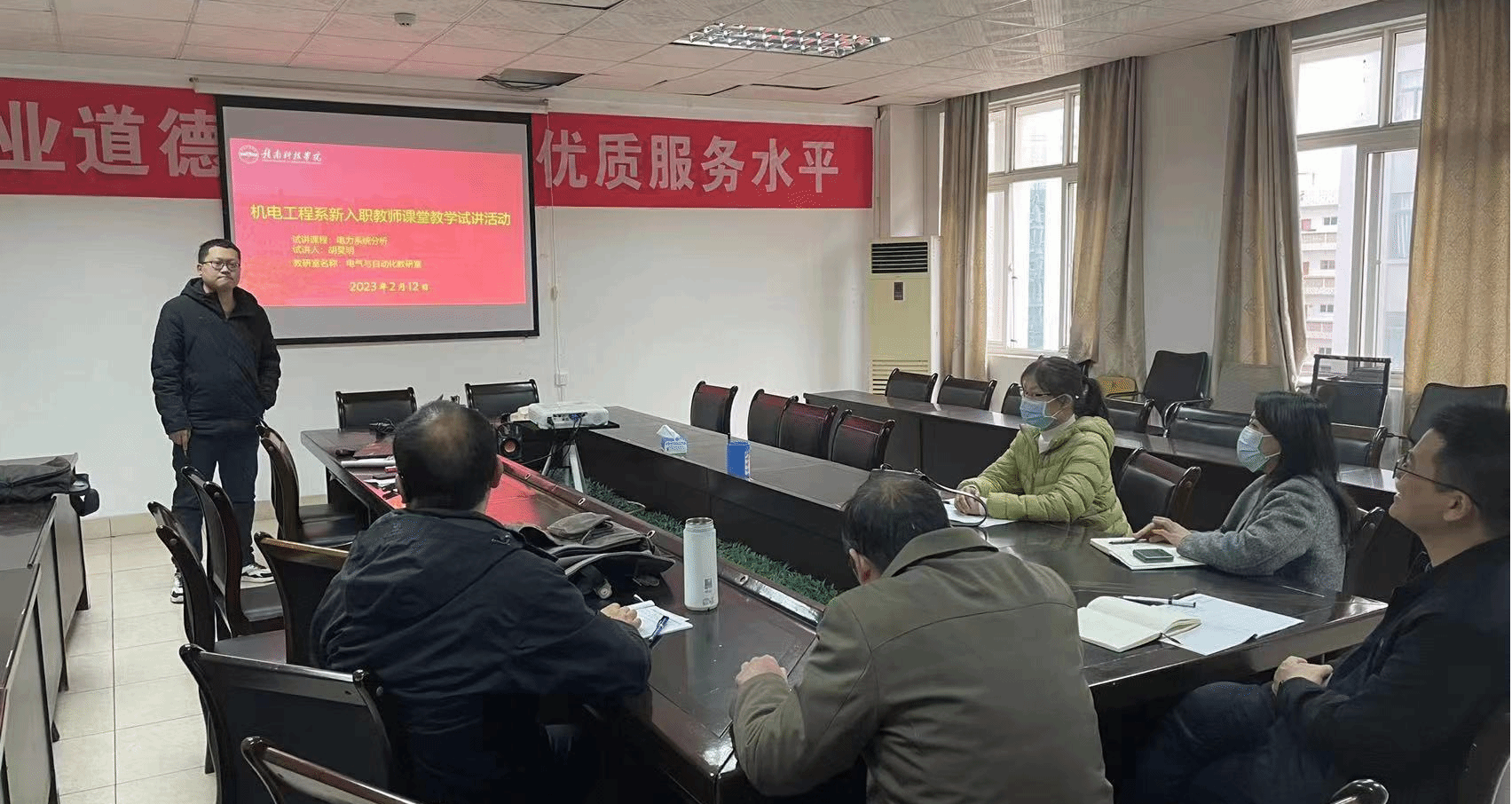 电气与自动化教研室的郭权和胡昊明两位新老师分别就本学期新授课程进行了试讲。试讲结束后,各位老师就试讲过程中的板书与PPT的结合、与员工的互动、知识的拓展等方面提出了建议和意见。提醒新教师应注意的内容衔接、案例的引入、授课内容的重点和难点的强调等。