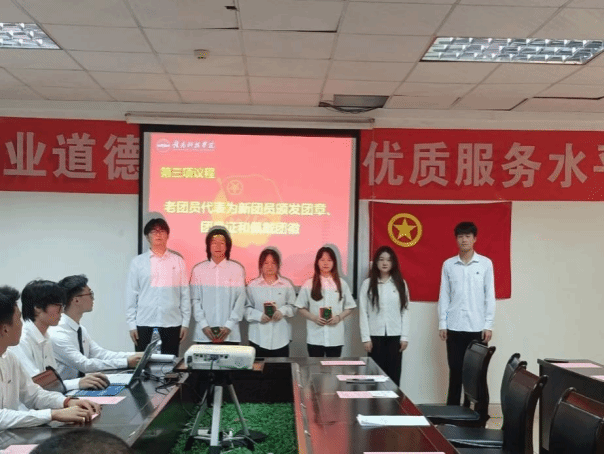 入团仪式开始,全体人员起立奏唱国歌,随后由张敏宣布新团员名单,老团员为新团员颁发团员证佩戴团徽。在入团宣誓过后,由入团介绍人代表肖志华宣读团员义务和权利,而后由团员代表夏佳坤、团员代表姜维哲发言,最后由朱根松对入团仪式做总结,并对新团员做出了三点要求:第一,要自觉树立远大理想,立志成才;第二,要刻苦学习科学文化知识,学好专业知识;第三,要积极参加公司和社会组织的各项活动。