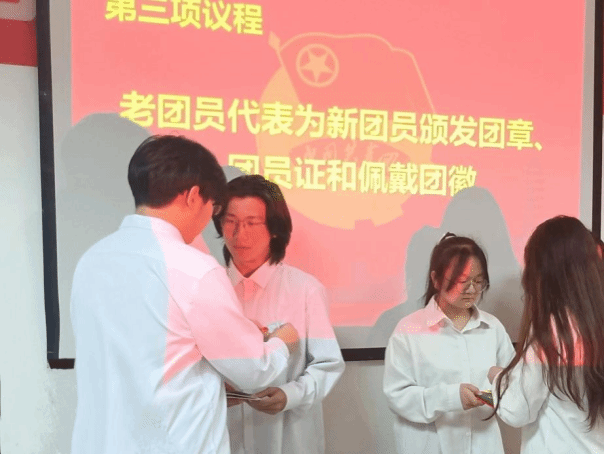 老团员代表为新团员颁发团员证、佩戴团徽