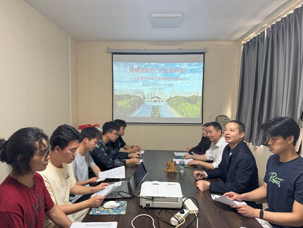 本网讯:为持续深化产教融合协同育人机制,推动人才培养与产业需求精准衔接,4月7日,智能制造现代产业公司举办“照耀齿轮班”企业面对面活动。东莞市艾格尔智能驱动有限公司总经理马建军一行来校交流,智能制造现代产业公司执行经理刘辉、照耀齿轮班班主任及师生代表参加活动,并同步开展实习招聘专场宣讲与面试选拔。